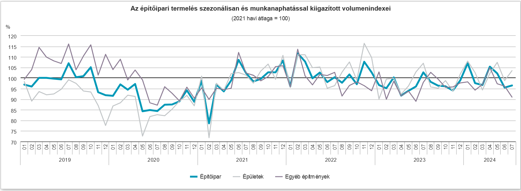 2024 júliusában az építőipari termelés volumene a nyers adatok szerint 6,2%-kal elmaradt az egy évvel korábbitól. Az építményfőcsoportok közül az...