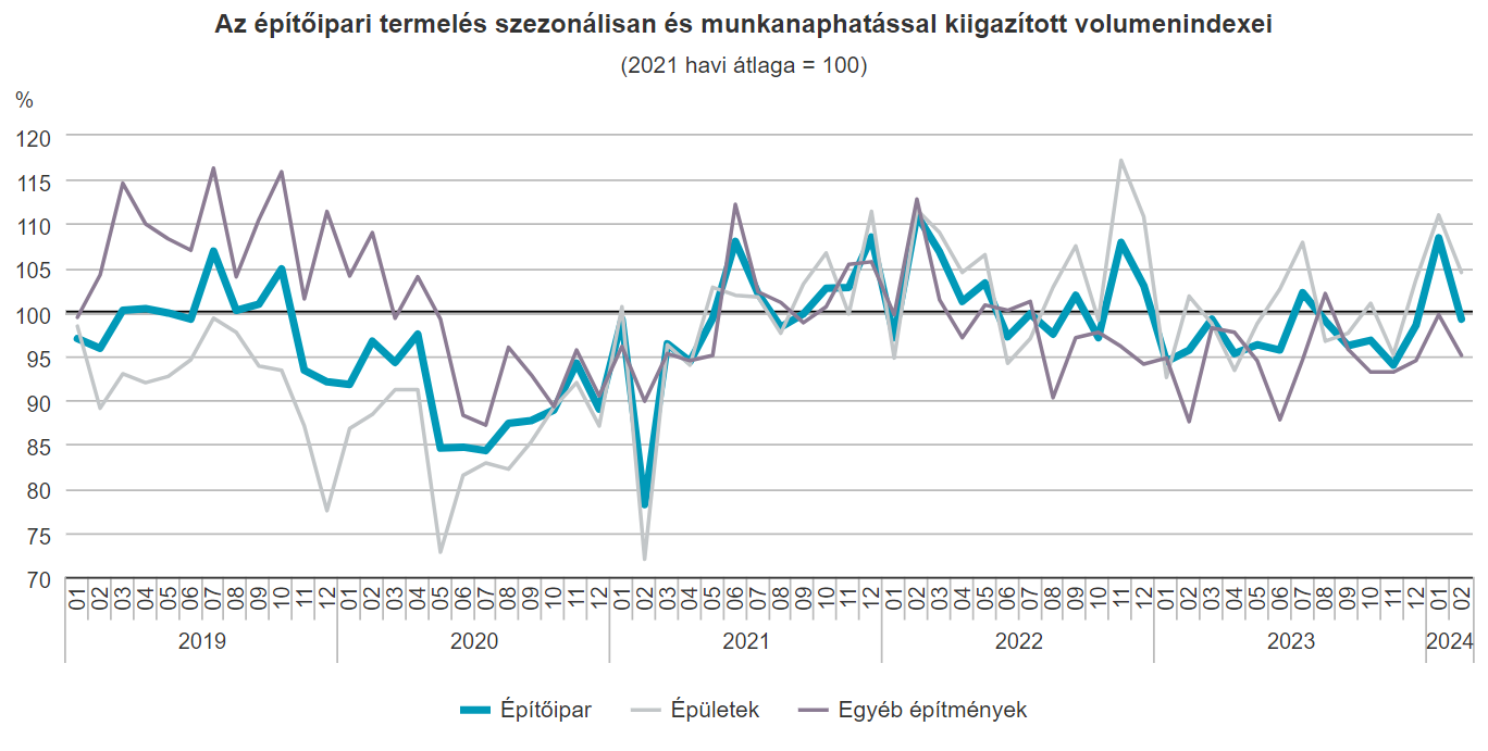 2024 februárjában az építőipari termelés volumene a nyers adatok szerint 3,2%-kal meghaladta az egy évvel korábbit. Az építményfőcsoportok közül az...