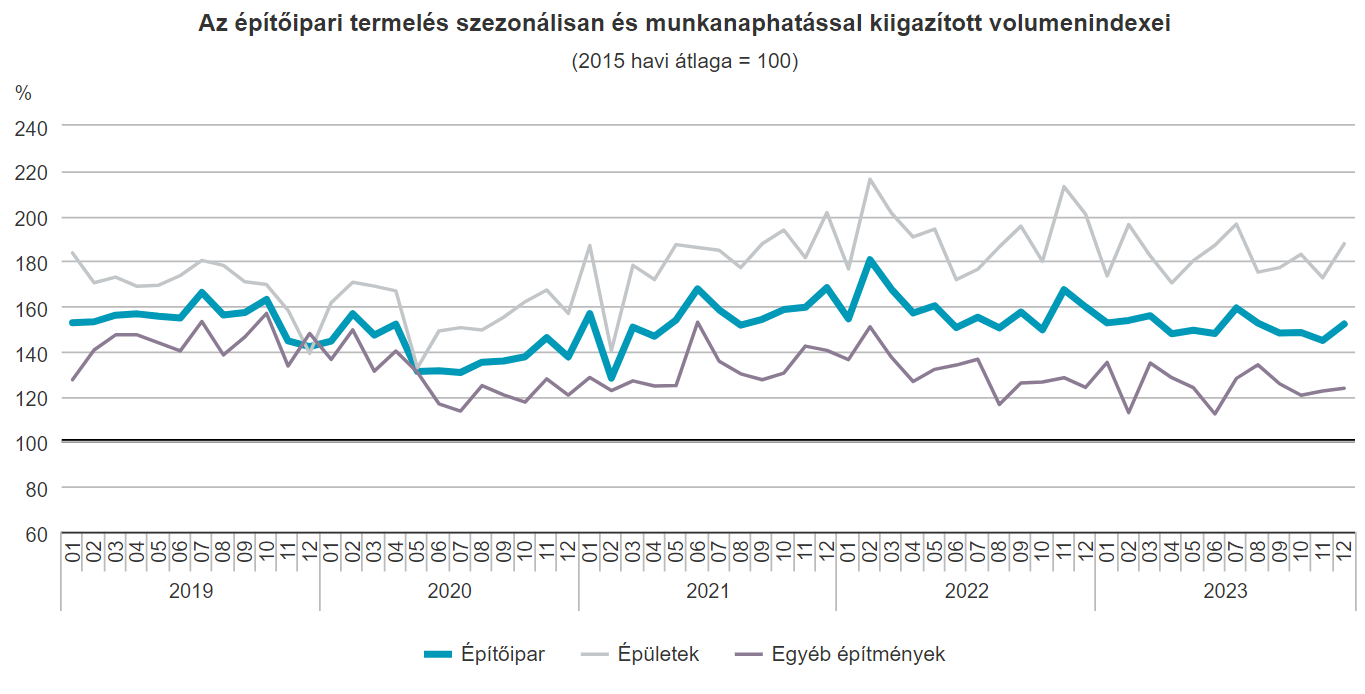 2023 decemberében az építőipari termelés volumene a nyers adatok szerint 4,3%-kal elmaradt az egy évvel korábbitól. Az építményfőcsoportok közül az...