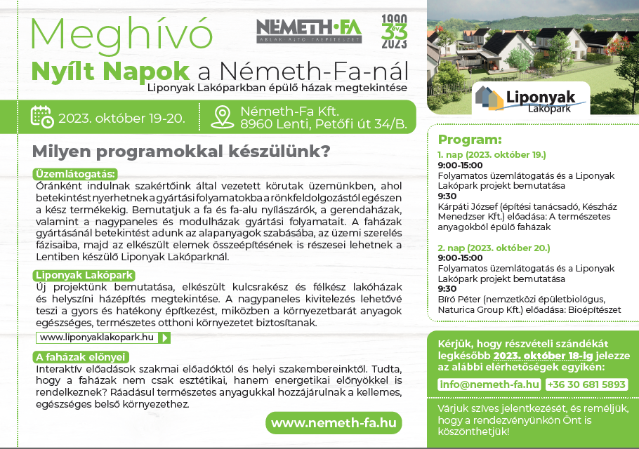 Az ÉVOSZ-MAKÉSZ tagszervezete, a Németh-Fa Kft. 2023. október 19-20-án nyílt napokat rendez Lentiben. Az üzemlátogatáson bemutatásra kerül a rönktől...